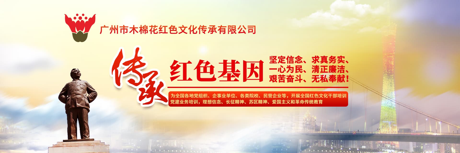 广州市木棉花红色文化传承有限公司是一家专业开展全国红色文化教育培训、党史学习的专业机构。我公司本着“以德为尚、崇尚理想、铸就辉煌”的理念,以“严谨、科学、务实、创新”的培训方针,以“最优培训,最佳服务”的培训宗旨,以“多形式、低成本、精品化、高质量”的培训理念,开展党员干部教育与培训、企业党的建设和培训、廉政建设、军训拓展和中小学生研学等培训项目,以不断推动和弘扬红色文化教育,传承红色基因。我公...